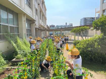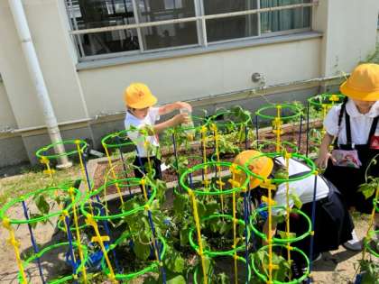 さわやかな朝の時間、1年生が大事に育てているアサガオに水やりをしていました。たくさんのつぼみがついています。