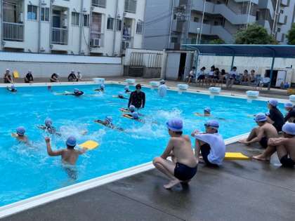 4年生のプール授業の様子です。ビート板を使って、泳ぎの基本を学んでいました。気持ちよさそうです。