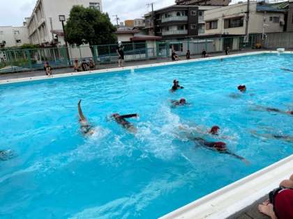3年生はバタ足練習をしたあと、手のかき方を先生に教えてもらいクロールに挑戦しました。蒸し暑い天候にあって、水の中は快適な様子です。「気持ちいい」という声があちらこちらで聞こえました。