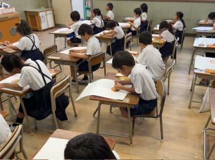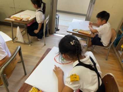 ひまわりの花の丸い部分に、自分たちで自由に色をのせていきます。実に色とりどりです。個性あふれるひまわりの絵ができそうです。