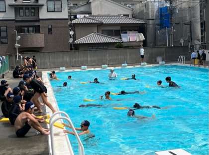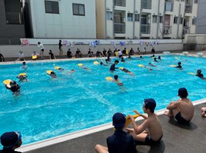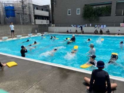 5年生のプール授業の様子です。平泳ぎの身体の動きを先生に教えてもらい、ビート板を使って練習しました。厳しい暑さにあって、水の中は気持ちよさそうです。