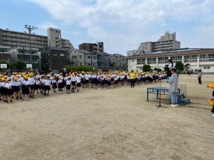 1学期最後の児童集会です。「メディシングボール」というゲームをしました。ペア学年でボールを全員に手渡ししていく速さを競うゲームです。協力しながら楽しく取り組むことができました。あわせて掃除がしっかりとできている学級を表彰する「ピカピカグランプリ」の表彰式を行いました。