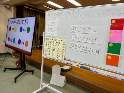 今日は一学期最後の「なかよしタイム」です。おたのしみ会を催しました。「〇×ゲーム」「ロープコースター」「逆さ言葉クイズ」の3つのゲームを友だちと協力しながら楽しむことができました。