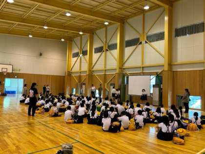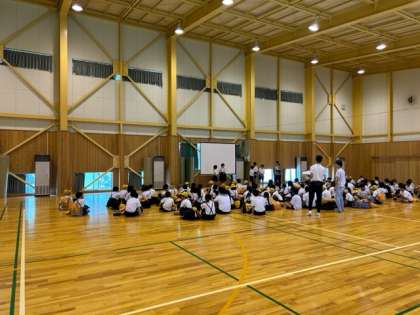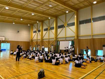 宿舎グリーンロッヂに到着し、開舎式を行いました。児童代表が宿舎の方に挨拶したり、宿舎の方から、宿舎での過ごし方などのお話をしていただきました。いよいよ2泊3日の林間学習生活が始まります。このあと、クラス集合写真を撮影します。