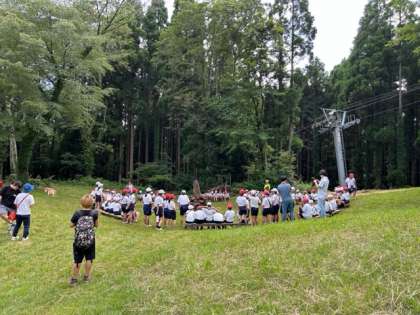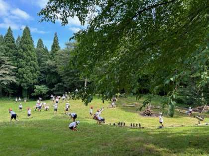 活動プログラムの隙間時間にキャンプファイヤー場にて、高原遊びをしました。場所の確認もしました。また、キャンプファイヤーで行うマイムマイムの振り付けも練習できました。