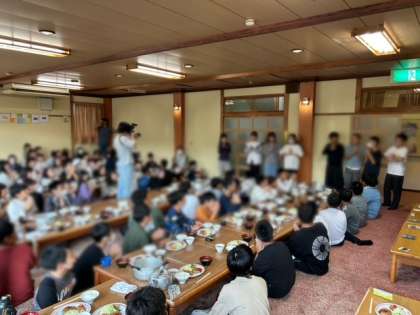 ゆっくりした入浴時間を経て、夕食タイムです。時間通りに集合できた子どもたちです。食事係が先に集まり、ご飯をよそったり、お茶を入れたりしてくれました。「いただきます」の挨拶の後、用意していただいた夕食をモリモリ食べる子、食べられる分だけきちんと食べる子といましたが、全体的によく食べていました。この後のキャンプファイヤーに向けて、エネルギー充電です。ごちそうさまをしてから、他の班の鍋を片付けてくれたり、最後までテーブルを拭いてくれたりと素敵な食事係さんもいました!