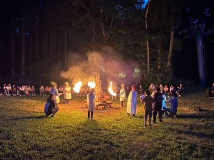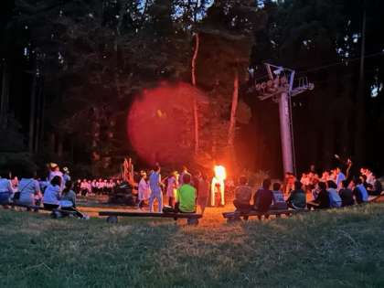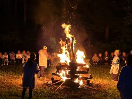 キャンプファイヤーが始まりました!「火の神」が登場し、火を分けてもらいました。炎を前に、レクレーションに移ります。