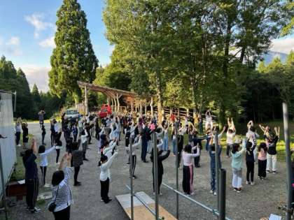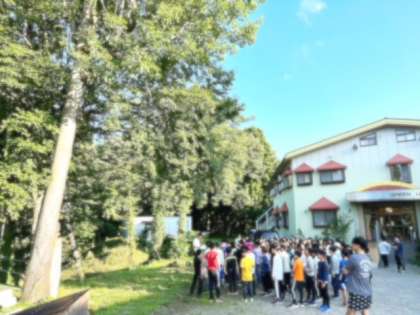 6時に起床した子どもたち、洗顔したり、布団片付けたりしながら、朝の集いに向けて準備を進めました。時間通りに朝の集いが始まりました。まだ眠そうな表情の子もいますが、ラジオ体操で体を動かし、目も覚めたかと思います。この後は、朝食です。