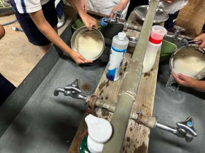 登山、謎解き大会を経て、自分たちで自分の昼食を作ります。飯盒炊飯とカレー作りがスタートです。宿舎の方に調理の説明を受け、調理役は調理開始です。米を研ぎ、野菜や肉を切ります。協力してできていました。手際もよかったです。
