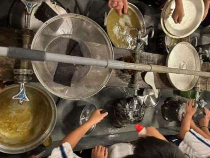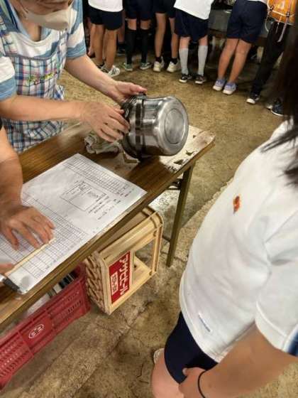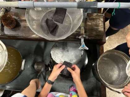 美味しくいただいた後は、お片付けの時間。黒くなったなべの底やご飯つぶ、洗うのは大変です。ここでも一生懸命に取りかかる子どもたちです。素敵でした。やり直しもありましたが、がんばって洗って、合格をもらいました!