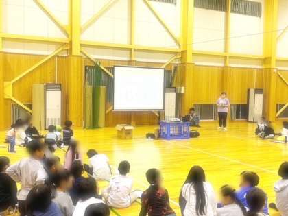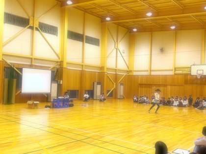 夜のプログラムですが、変更することになりました。体育館でのプログラムへと変わりました。暑さもあり、疲れのみえる子も多く、無理をしてケガなどが起きないようにと考えました。まず、???の内容から。雨用プログラムになったときに組み込めたらと準備していたバトン演技を披露してもらいました。付添教員でなく、参加児童が披露してくれました。観ている子どもたちは驚きの表情を見せ、大きな拍手を送っていました。素晴らしかったです!!そして、謎解き第二弾。難問もあり、盛り上がっていました。
