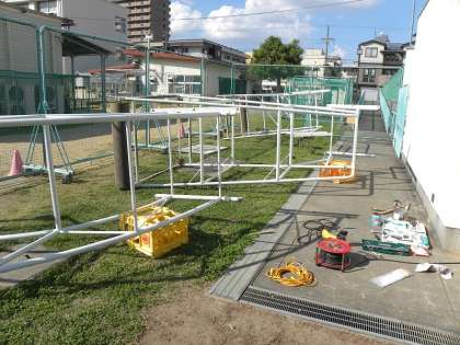 運動会が終わった今日は、管理作業員さんが、2学期の授業にむけて運動場のバスケットゴールボードを新しく作り直してくれています。よく遊ぶのですぐに傷んでしまいます。新しくなるのを楽しみに待っている子どもたちです。