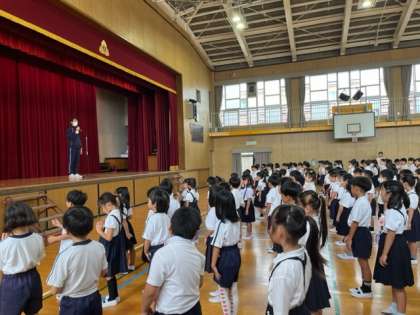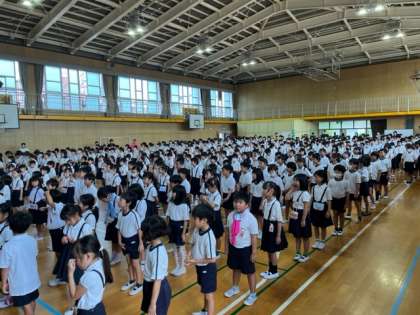 講堂にて朝会を行いました。校長からは、「敬老の日」のもつ意味を伝えるとともに、お年寄りへの感謝の気持ちをいつも忘れないように、といった主旨の話をしました。まだまだ暑さが残り夏休みの疲れがでそうなこの時期、生活のリズムを崩すことなく、今週も楽しく学校生活を送ってもらいたいものです。