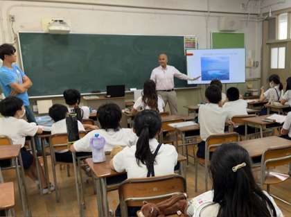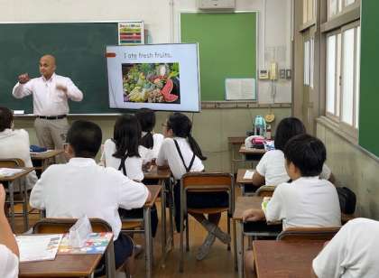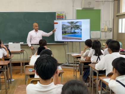 英語指導の先生が夏休みに海外の海で過ごした様子を画像を使いながら英語で紹介してくれました。みんな興味深く聞き入っていました。
