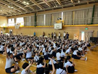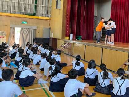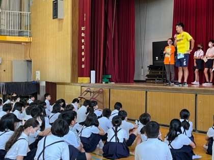 今朝、講堂で行った児童集会では「声あてゲーム」を行いました。複数の児童が同時に一音ずつ発した言葉を組み合わせて、何という単語になるかをあてるゲームです。なかなか難しいゲームです。体育主任の先生からは安全のために運動場での遊び方についての注意がありました。