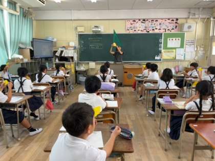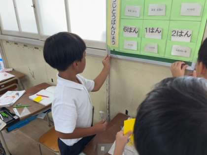 先生から直角について教わったうえで、教室のなかにある「直角」を探しました。三角定規をあてて「**個見つかった」と見つけた数を楽しそうに競い合っていました。