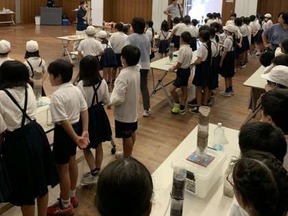 説明員の方から話をうかがいながら、施設を学級ごとにまわりました。子どもたちは熱心に話に耳を傾けていました。