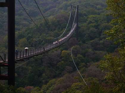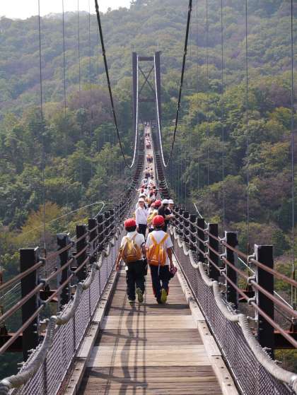 高くて長いつり橋です。ちょっと怖そうですが、みんな渡り切りました。