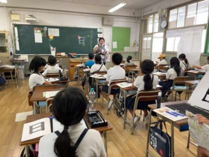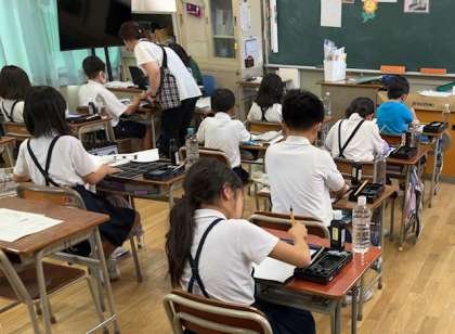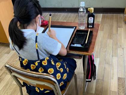 書写の授業の様子です。筆をしっかりとたてて、力強い文字を書いていました。