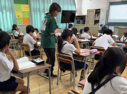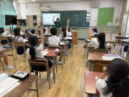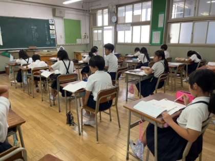 主語と述語を学んだうえで、「おだやかに」「きれいな」といった、それぞれをくわしく表す言葉について考えていきました。