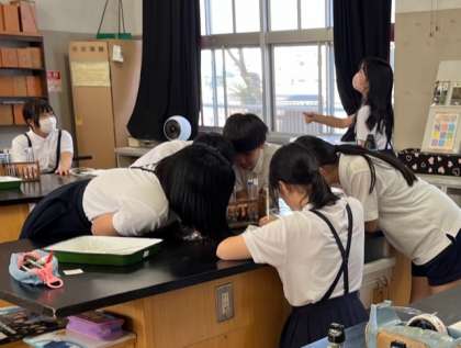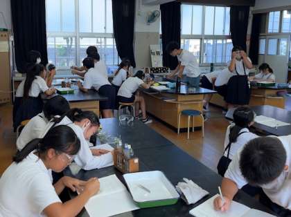 うすい塩酸を金属に加えたときの変化を確認する実験です。グループごとに鉄とアルミニウムが塩酸に溶ける様子を興味深く観察していました。
