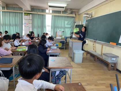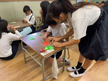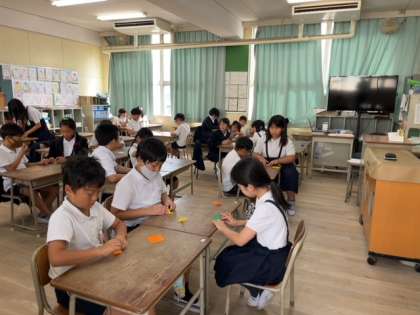 5時間目に全校で「折り鶴」をつくる時間を設けました。1年生と6年生、2年生と4年生、3年生と5年生といったペア学年ごとに各教室にわかれて、小さな色紙で鶴を折りました。平和への願いを込めてみんなしっかり取り組んでくれました。また、下級生に折り方を教える上級生の姿が素敵でした。できあがった鶴は千羽鶴にして、来月6年生が広島へと持って行ってくれます。