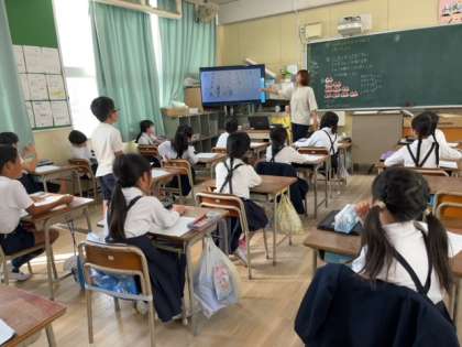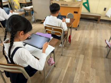 2個ずつ増えるリンゴの数を調べるなかで、2の段の九九の考え方を学びました。タブレットPCを使って、考え方について発表しました。