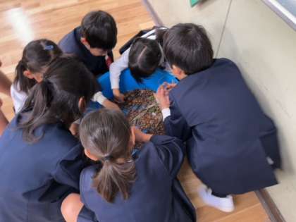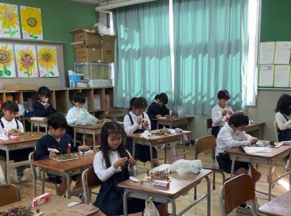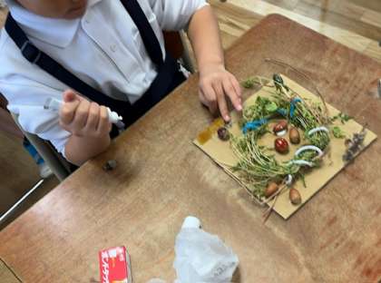 先だって校外学習で出かけた深北緑地から持ち帰ったどんぐりを使って、飾りづくりをしました。お気に入りの形や色を選んでボンドで貼り付けていきます。個性豊かな作品がいくつもできあがりました。