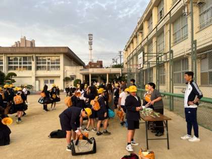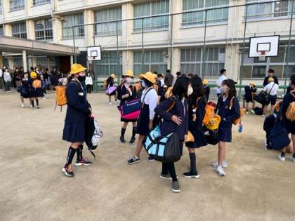 さわやかな朝、晴天のもと、子どもたちが大きな荷物を持って登校してきました。
