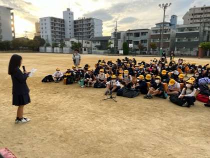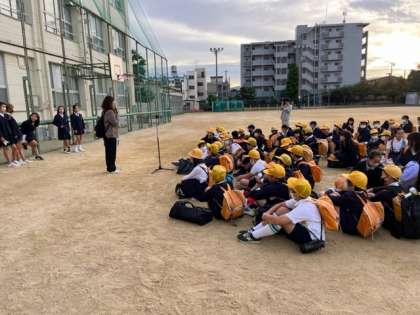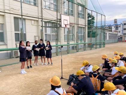 出発式です。校長の挨拶、児童代表のことば、出発にあたっての諸注意がありました。これから乗車するバスへと向かいます。