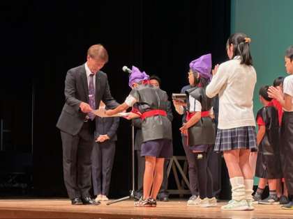 本日、鶴見区民センターにて、第46回鶴見区子ども文化祭が開催されました。鶴見区の8つの校下の子どもたちが登壇し、今津は4年生がエイサーを披露してくれました。舞台上での子どもたちはとても凛々しく感じられました。観ている人たちを幸せな気持ちにしてくれたということで、特別賞の「HAPPY賞」が贈られることとなり表彰状を受け取りました。