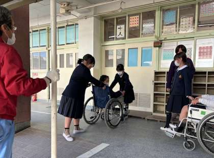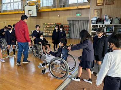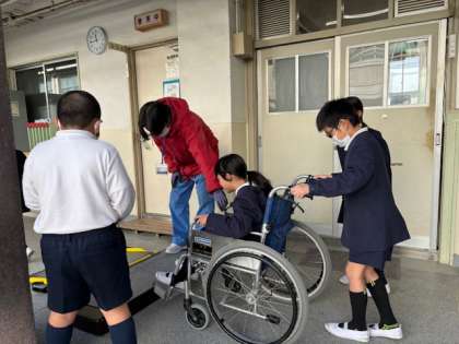 大阪市立心身障がい者リハビリテーションセンターの方に多数お越しねがい、4年生に向けての車いす体験学習が行われました。車いすを押す側を体験するだけでなく、実際に車いすに乗ることで障がい者の方が不安なく乗ってもらうためにはどうしたらよいかも感じることができたようです。
