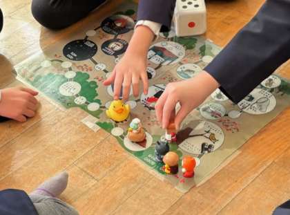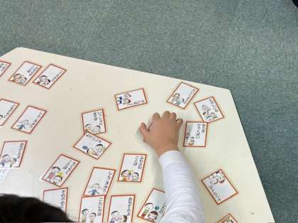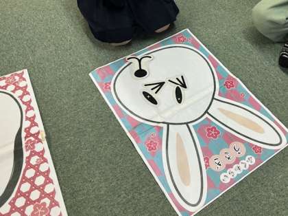 今日のなかよしタイムは多目的室を使っての「お正月あそび」です。「カルタ」「坊主めくり」「ふくわらい」「すごろく」といったゲームをグループに分かれて楽しみました。