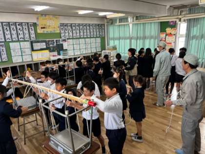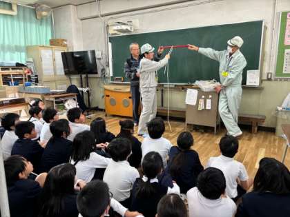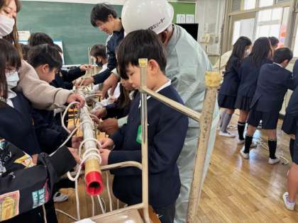 4年生では、ロープの結び方について学びました。本結び、巻き結び、もやい結び、など結び方の説明を受けてみんなで実際に結んでみました。