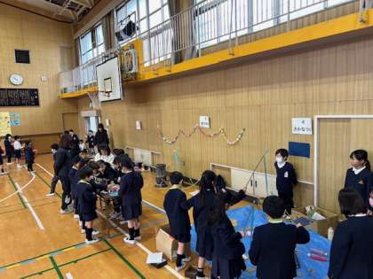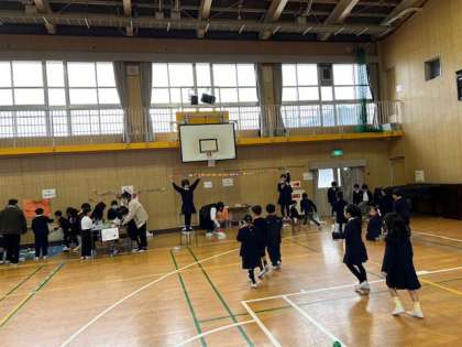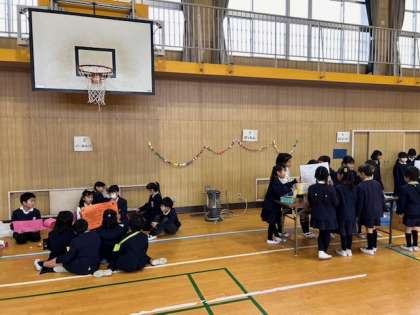1年生、2年生がおもちゃ交流会を行いました。2年生が生活科で作成してきたおもちゃを各ブースに準備して、1年生がグループごとに回ります。1年生は楽しそうに遊んでいました。はじめの言葉や、ルール説明など、2年生はとてもがんばっていました。一学年上の成長を感じました。とても素晴らしい交流会となりました。