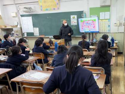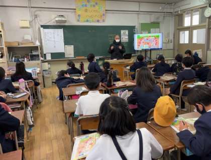 大型モニターに映した地図を見ながら、英語で道順の伝えるという学習を行いました。「むずかしい」と言いながらも、楽しそうに発言する児童が多かったように思います。
