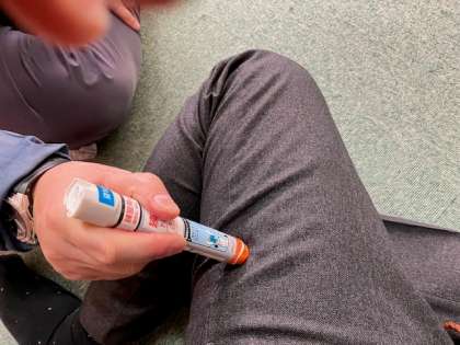 入学式を前に研修会を行いました。エピペンの練習用簡易キットなどを使って確認しました。