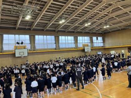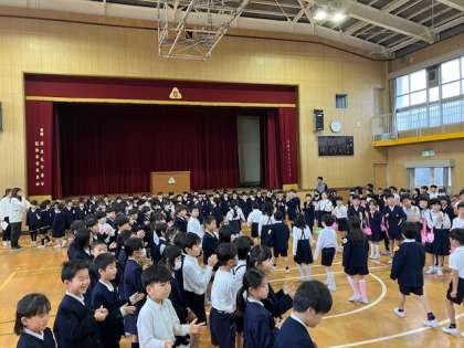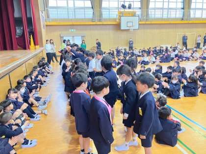 全学年揃っての1年生歓迎会です。1年生は3年生から大きなペンダントを首にかけてもらいました。昨日に続き、今日は1年生にたくさんの大きな拍手が送られました。