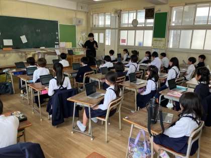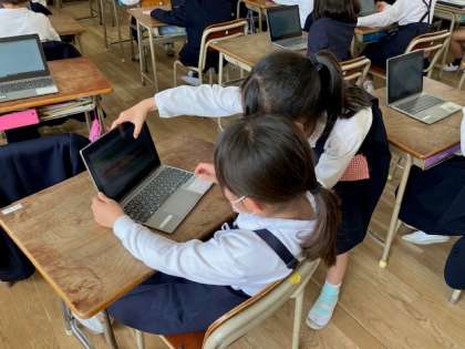 2年生の教室です。タブレット端末の使い方について確認していました。先生の話を聞き、互いに教えあいながら進めることができています。
