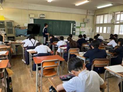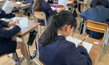 最高学年になってのそれぞれの思いを原稿用紙に書き記します。わからないことは先生に質問しながら、集中して作文に取り組んでいます。