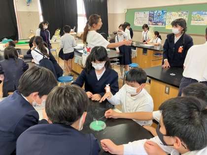 3組です。廊下に線香の匂いが漂ってきました。先生の指示を聞き、しっかりと換気をし安全に注意しながら実験に取り組んでいます。