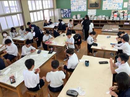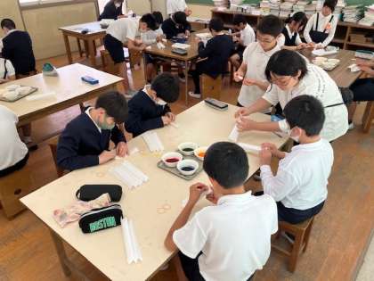 2組、3組です。図工室で和紙を使って作品を仕上げます。自分の思うようにはできないけれど、みんなが失敗しない作品です。