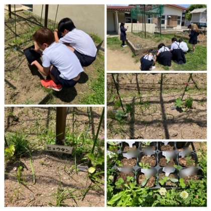1組が学習園で育てているヘチマやヒョウタンなどの観察を行っていました。タブレット端末を使って、成長の様子を日々確認できるように取り組んでいます。