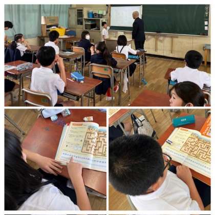 1組です。児童一人一人が外国語の先生と会話をする学習をしていました。