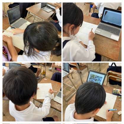 2組は、朝顔の観察でタブレット端末を使っています。写真を保管し朝顔の育つ経過を確認しています。
