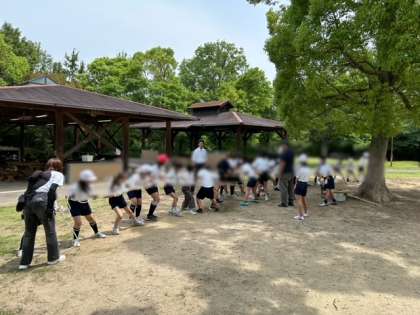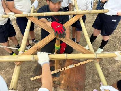 説明を聞いて、火起こしスタート!クラスのみんなで協力します。役割も決めて、信頼しあう。