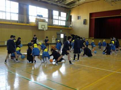 一緒に歌を歌ったり、小学校生活の劇やクイズをしたり、1年生の体育で学習する「しっぽとり鬼ごっこ」や「的当てボールゲーム」をしたりして楽しみました。