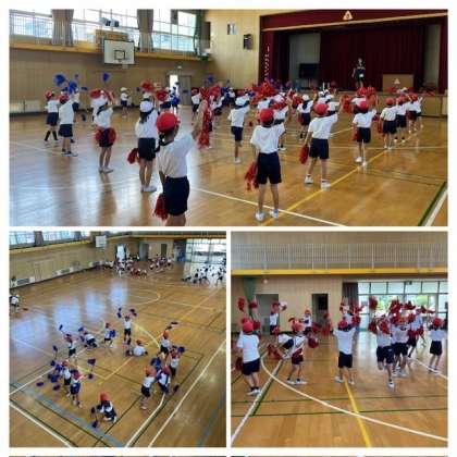 2年生は、今津地域の盆踊り大会でもながれていた名曲「学園天国」を団体演技で踊ります。曲に合わせて、最後のポーズまで見事完成しました。先生も我を忘れて、楽しく歌いながらの練習です。