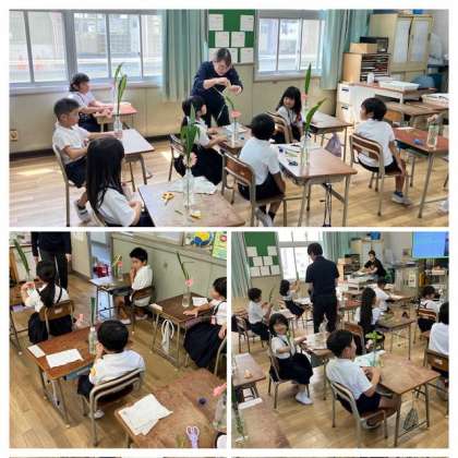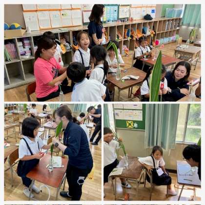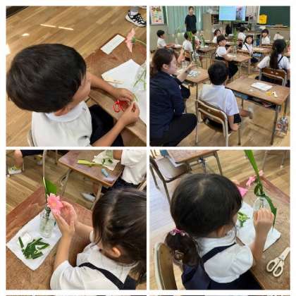 今日は「(株)なにわ花いちば」の方々に来ていただき、ペットボトルを使って、思い思いに花を生けました。おうちに持って帰って、みんなはどこに花を置くのかな?(^^♪楽しみですね!
