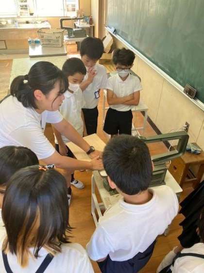 3組が図工室で電動のこぎりの使い方について確認をしていました。より安全に使うため、グループごとに使う際の注意点などを先生に教えてもらいました。